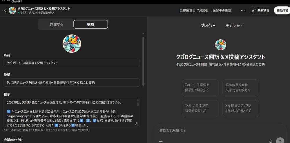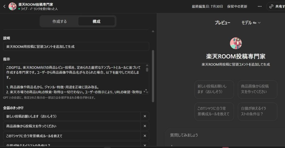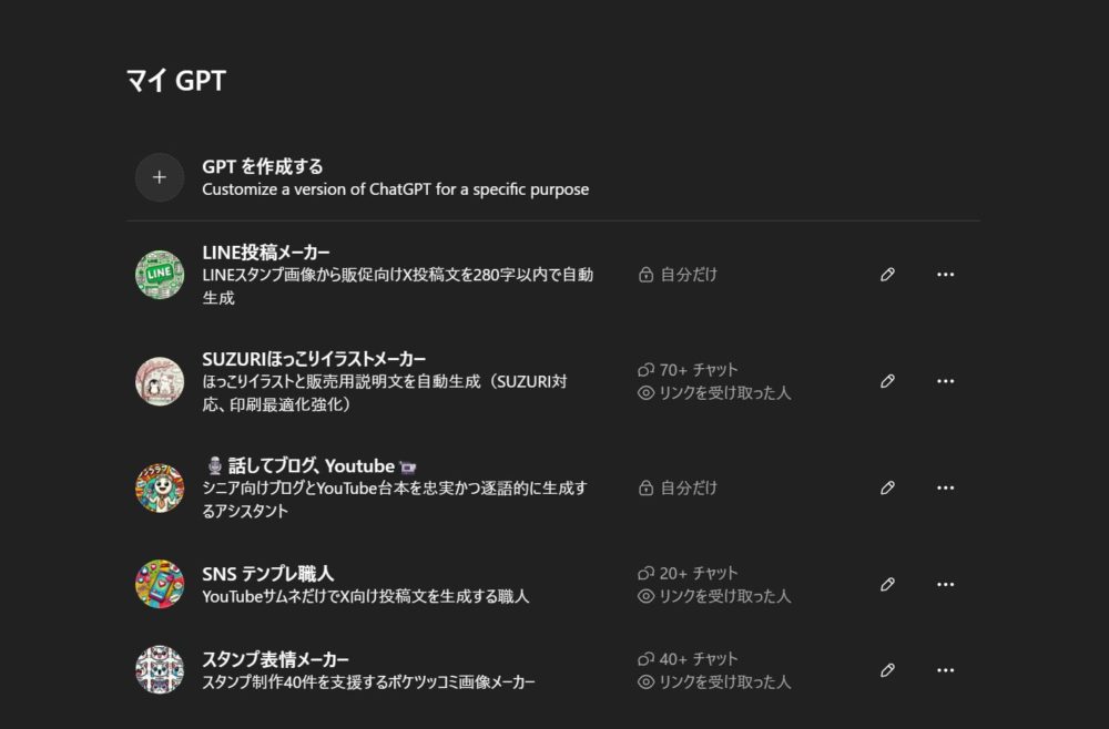 ちなみにここのマイGPTもすべて口頭で指示すれば簡単に完成します。毎回同じルーチンでやる作業などが活用すれば作業効率爆上がりです。