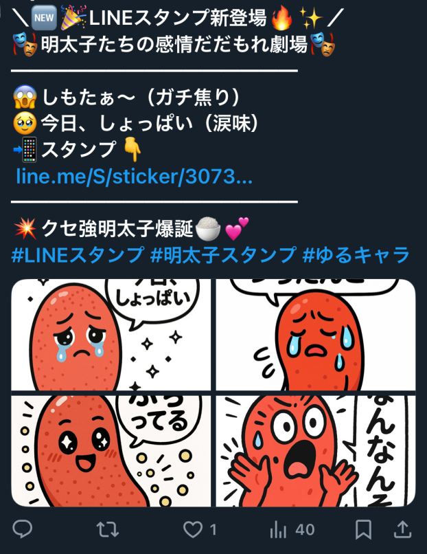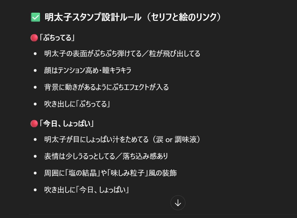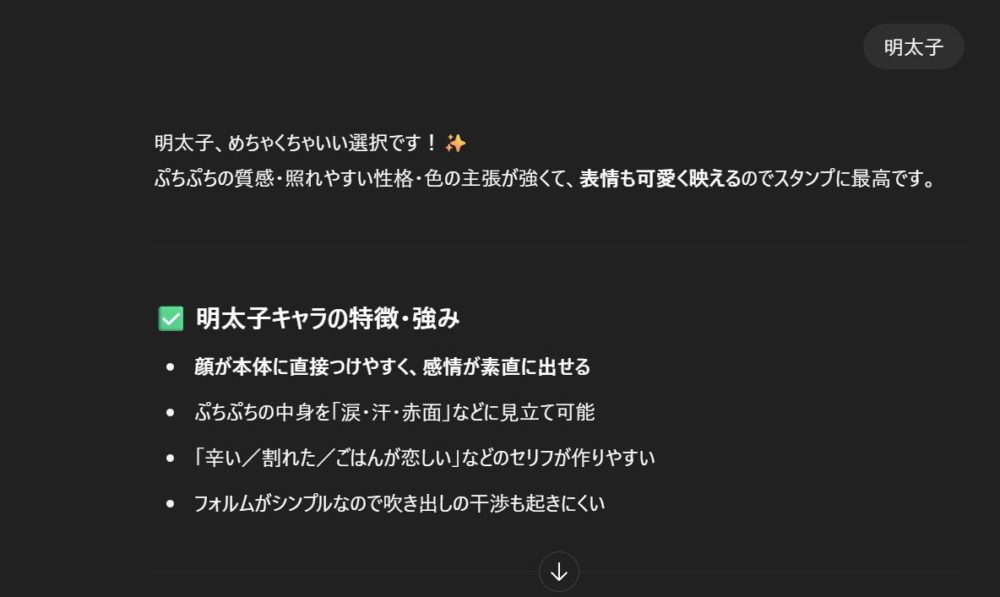 まず、キャラを口頭で指示すると、キャラ特徴考えてくれます。(例;明太子)