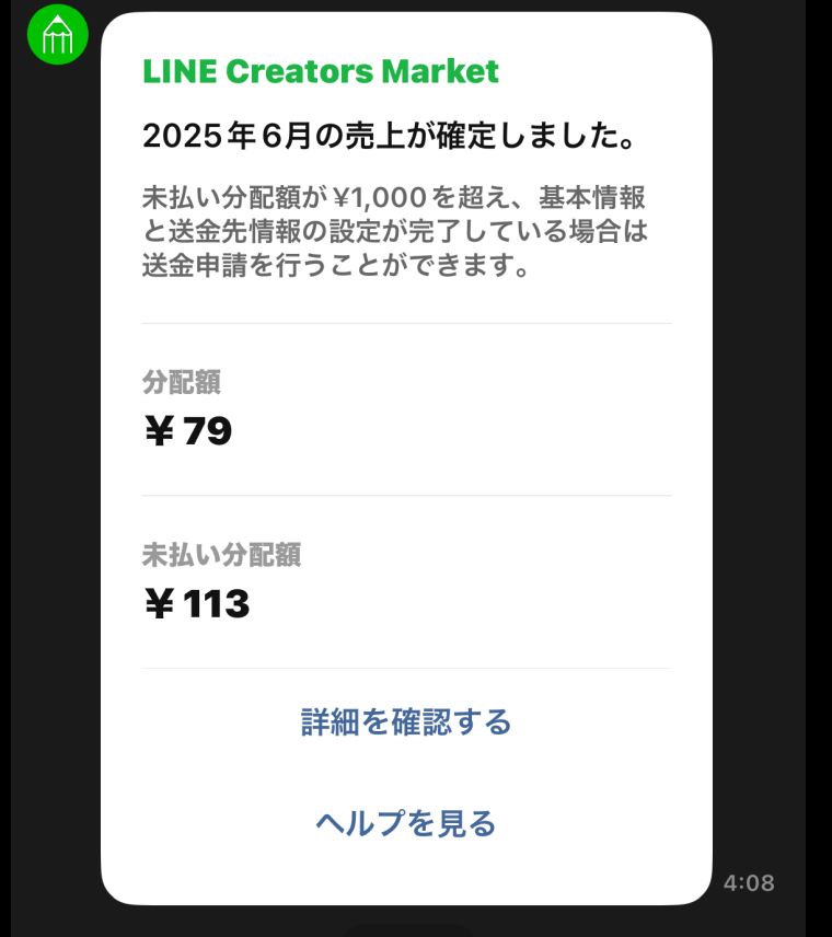 1日1セット(40個)作ることも可能で、約一ヶ月で110円の売上。LINEスタンプは1,000円に達するまでは出金できませんが、継続すれば必ず資産にもなりますね。
