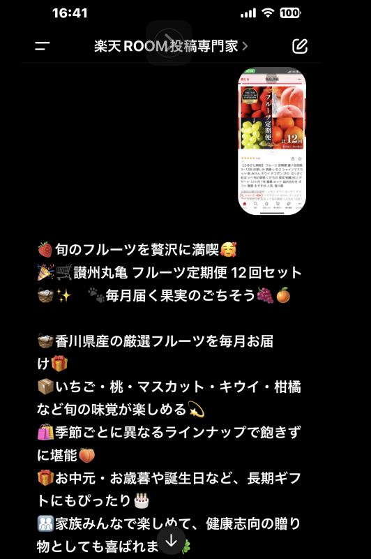商品を選び、キャプチャを撮り、ChatGPTに「楽天ROOM用コメント+絵文字入りで書いて」と頼めば、数秒でテンプレートに沿った説明文が完成。投稿作業もコピー&ペーストで完結します。