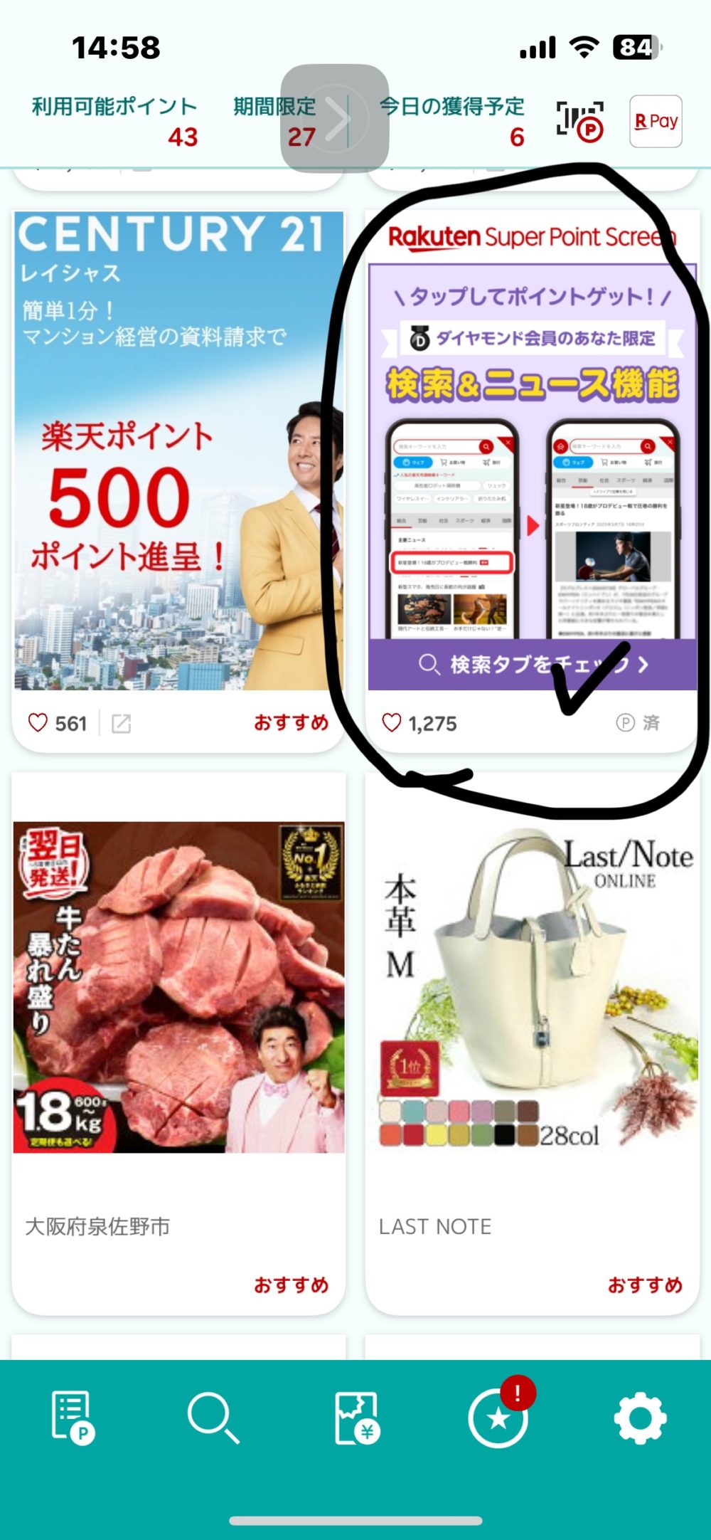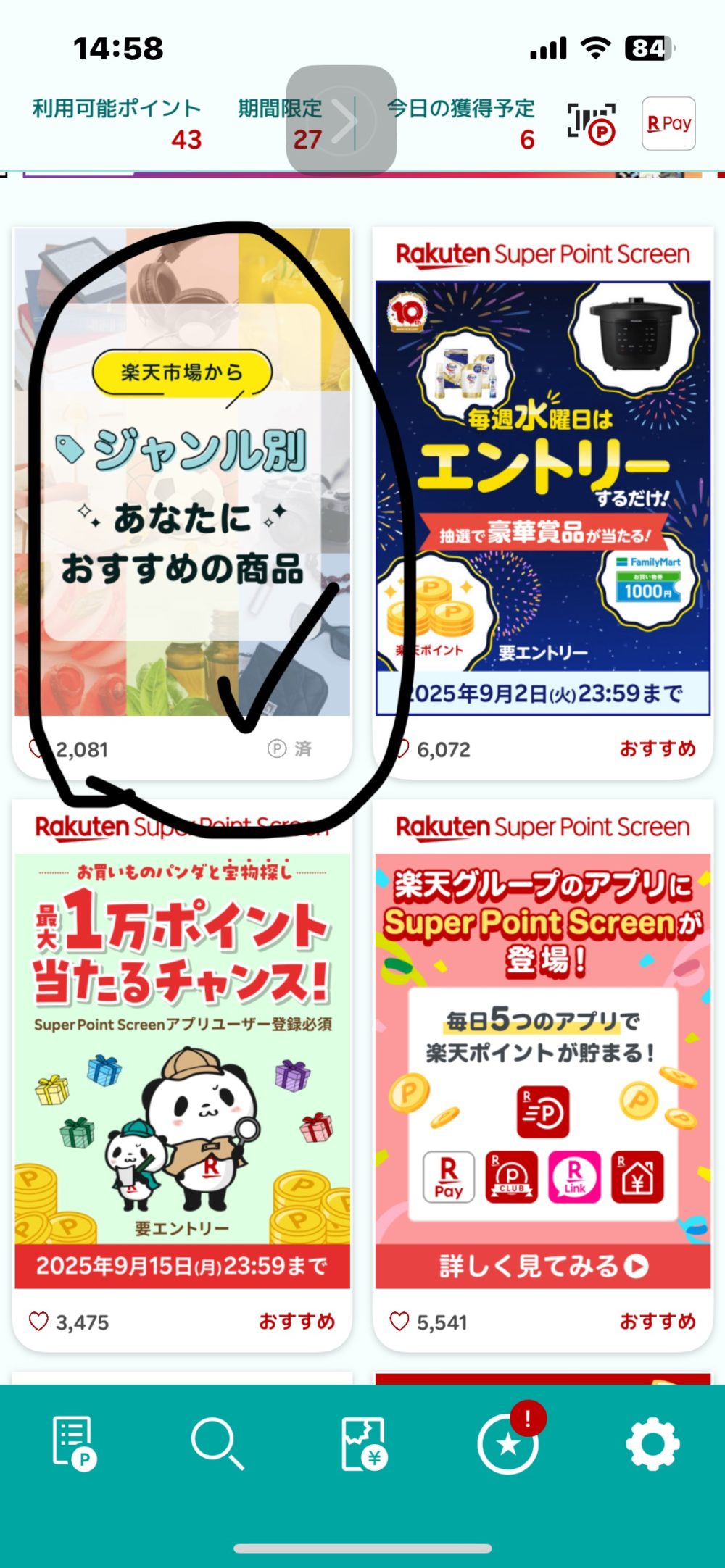 - 起動後下にスクロール →”見てポイント”を開き、 広告タップ → 毎日1pt🉐以上