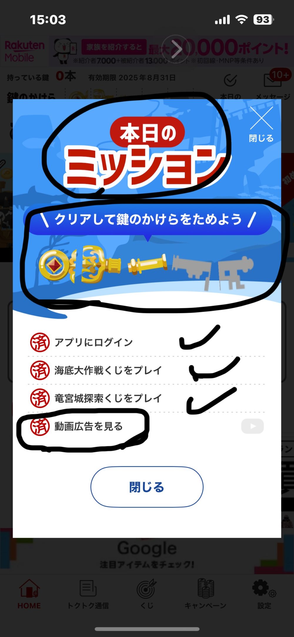 - 本日のミッションの動画広告みても”鍵のかけら”が一つ獲得可能です