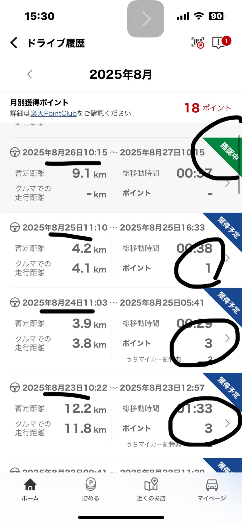 - 毎日ドライブ開始 → 2km以上運転で1pt🚗