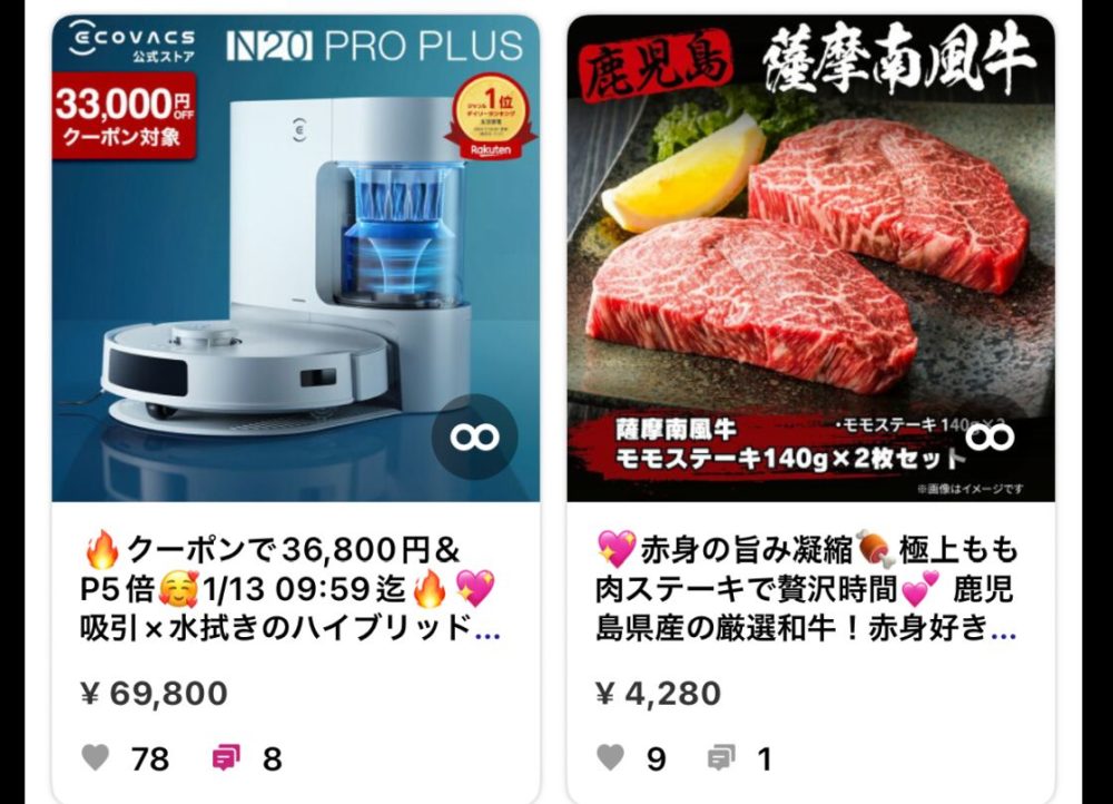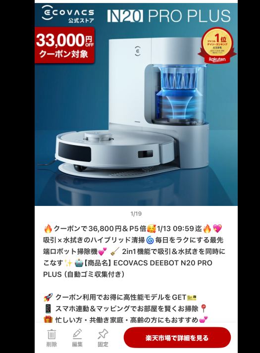 家電製品の掃除ロボット。楽天ルームを携帯で見たときの、携帯の商品掲載の”フォロ中”画面三行に、キーポイントをしっかり書くのも最も重要だと思います。