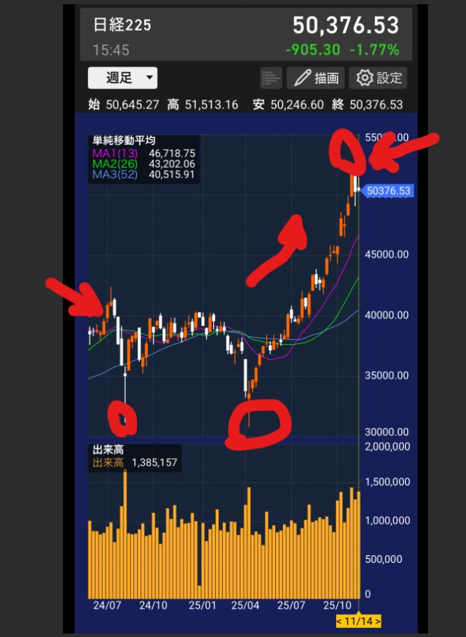 10月初めの段階では、日経平均はおよそ46,000円でした。それがなんと11月のはじめに53,000円近くまで一気に上昇⤴️