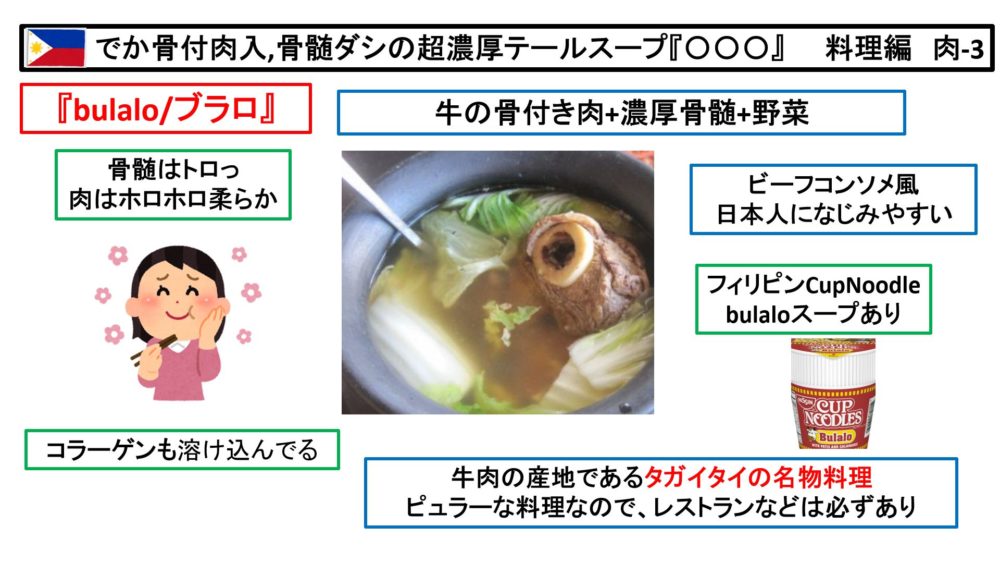 フィリピンの料理で、でかい骨付肉の入った、トロっと骨髄ダシの超濃厚テールスープの料理の名前をご存じですか?