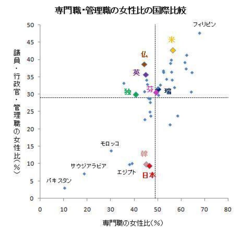 (女性管理職比率:ILO (2018年) 引用)